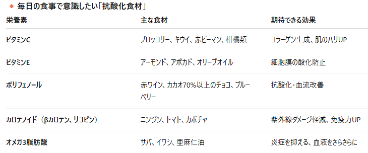 👉 糖化対策もポイント血糖値を急上昇させない工夫(野菜→たんぱく質→炭水化物の順で食べる、甘い飲料を控える)も、体の“焦げ付き”を防ぎます。