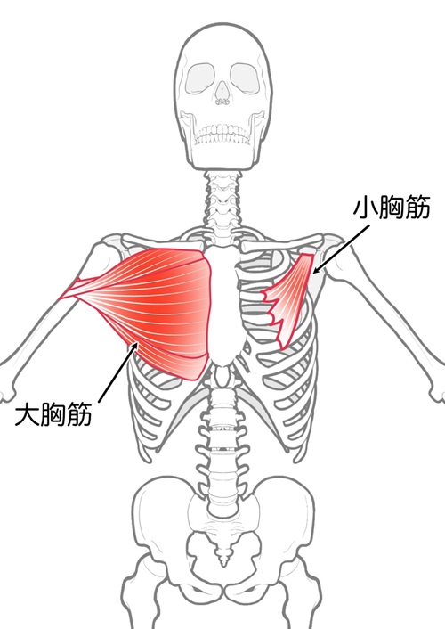 肩甲骨を前下方に引く筋肉で、ここが硬くなると肩が内側へ巻き込みやすくなります。